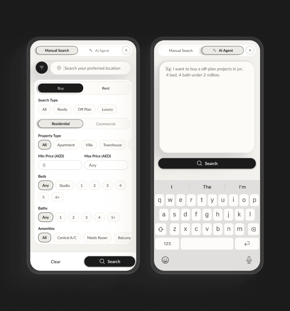 I positioned the AI Agent as a peer to Manual Search via a UI toggle, rather than dropping a standard chatbot into the corner of the screen.